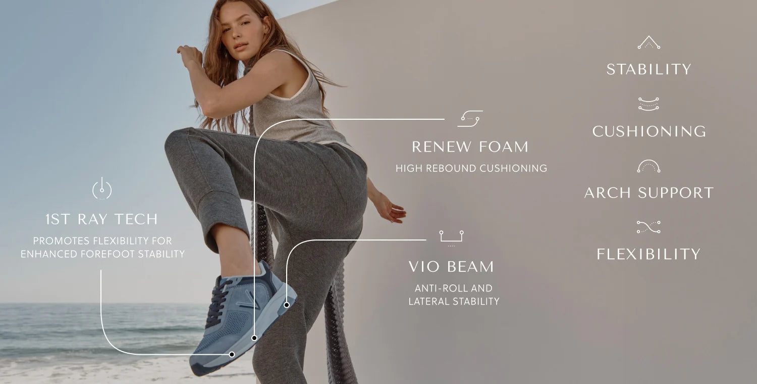 - Vio-Beam anti-roll and lateral rigidity technology minimizes foot movement to prevent injury. With the added stabilizer in the heel, Vio Beam improves the wearer's balance while offering flexibility at the forefoot to support the natural heel-to-toe walking stride motion.