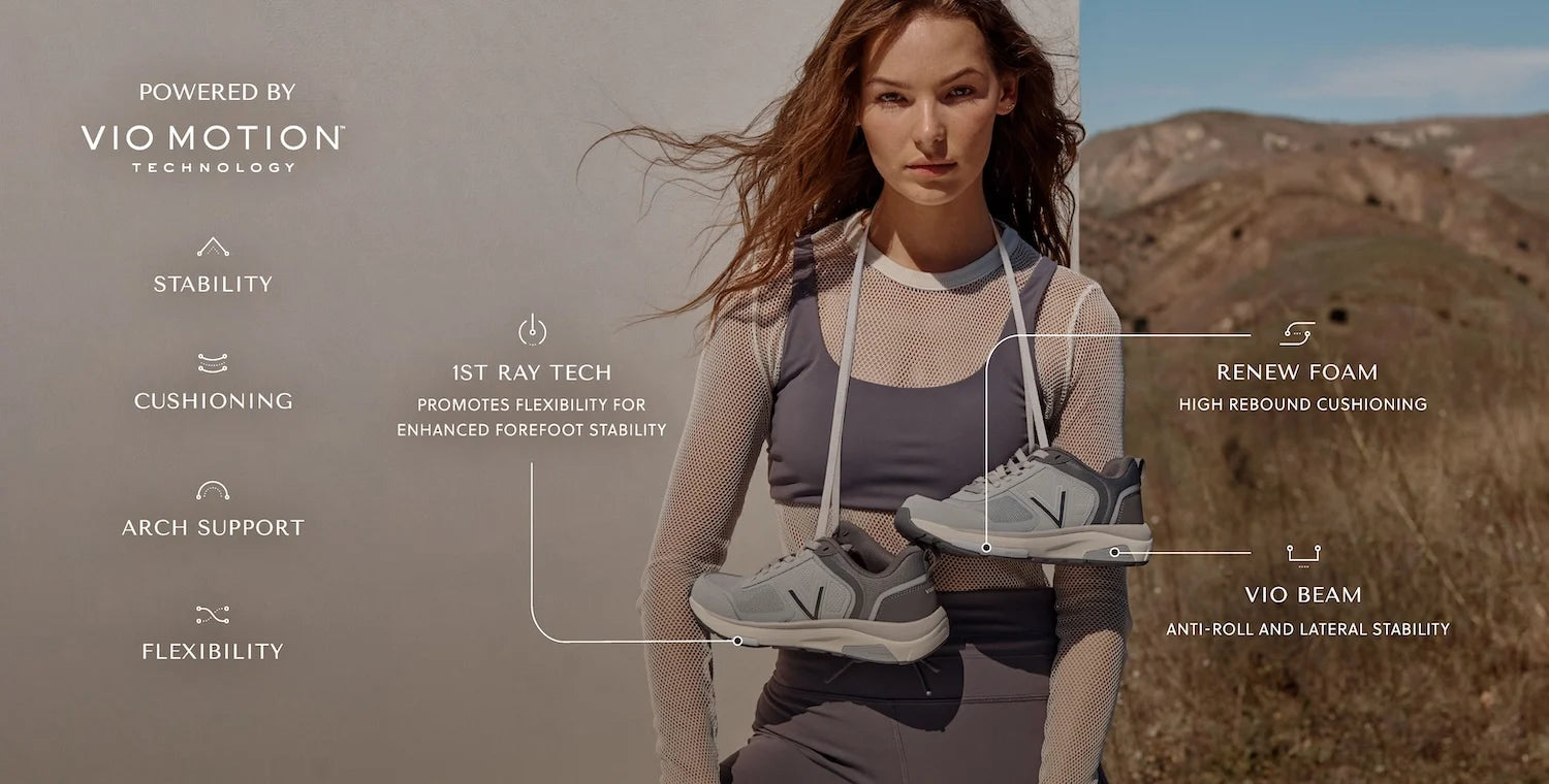 - Vio-Beam anti-roll and lateral rigidity technology minimizes foot movement to prevent injury. With the added stabilizer in the heel, Vio Beam improves the wearer's balance while offering flexibility at the forefoot to support the natural heel-to-toe walking stride motion.